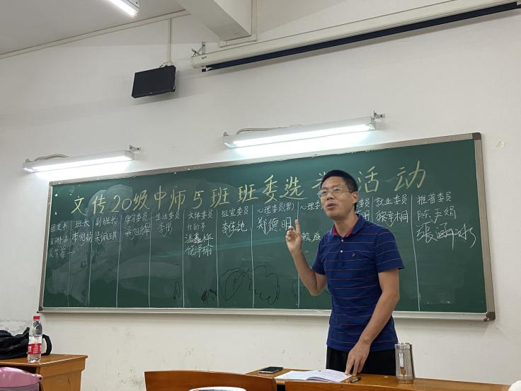 竞选环节结束后,班主任蒋颖老师发表讲话。蒋颖老师首先感谢了组班以来的两位班级临时负责人,王楠、冯英明同学,以及此次班会台前幕后的众多志愿者,其次,他表示班内许多同学在此次班会中现场成长,各位参选人敢于登台,为锻炼自身创造了良好的机会,台下的同学们作为投票人也吸收了许多竞选或演讲技巧。最后,蒋颖老师倡议同学们给予自己掌声,以鼓励同学们不断增进自己的实力,建设更加团结、优秀的中师5班。