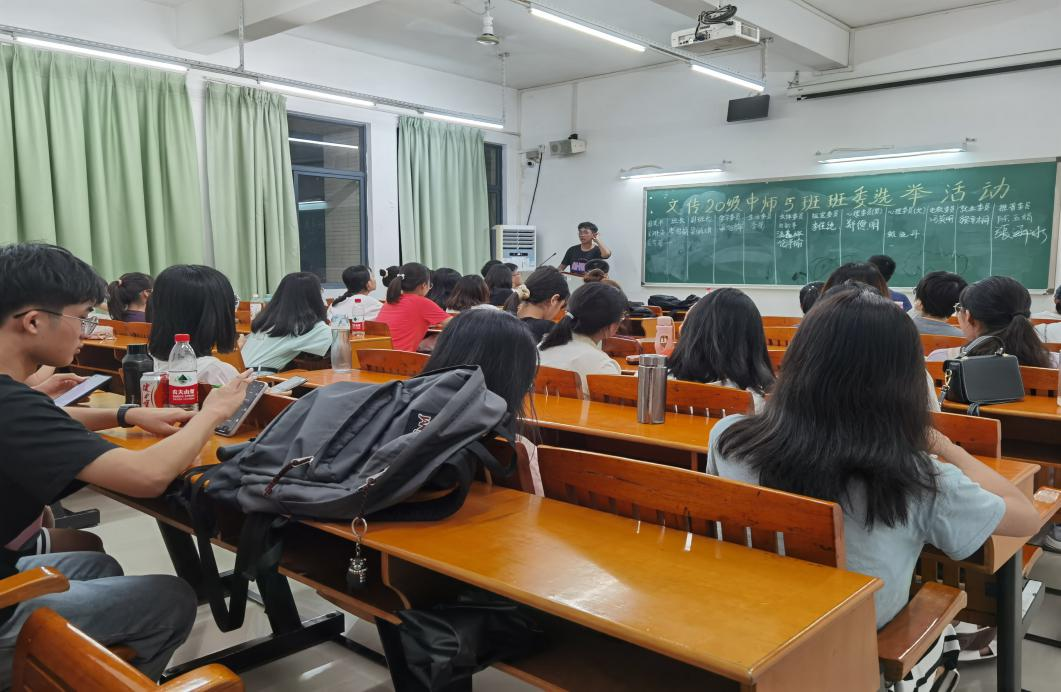 2021年8月31日晚18:40,伴着夕阳与晚霞,20级中师5班第一届班委竞选活动在白云校区一教111教室顺利进行。出席本次会议的有文传公司职教语文研究中心主任暨20级卓越班班主任蒋颖蒋老师,幕后工作人员有刘凯俊、苏茵妮、陈晓曼同学,本次会议由谢昌文同学主持。全体中师5班齐聚一堂,共同探讨、推选班级的第一届班委。