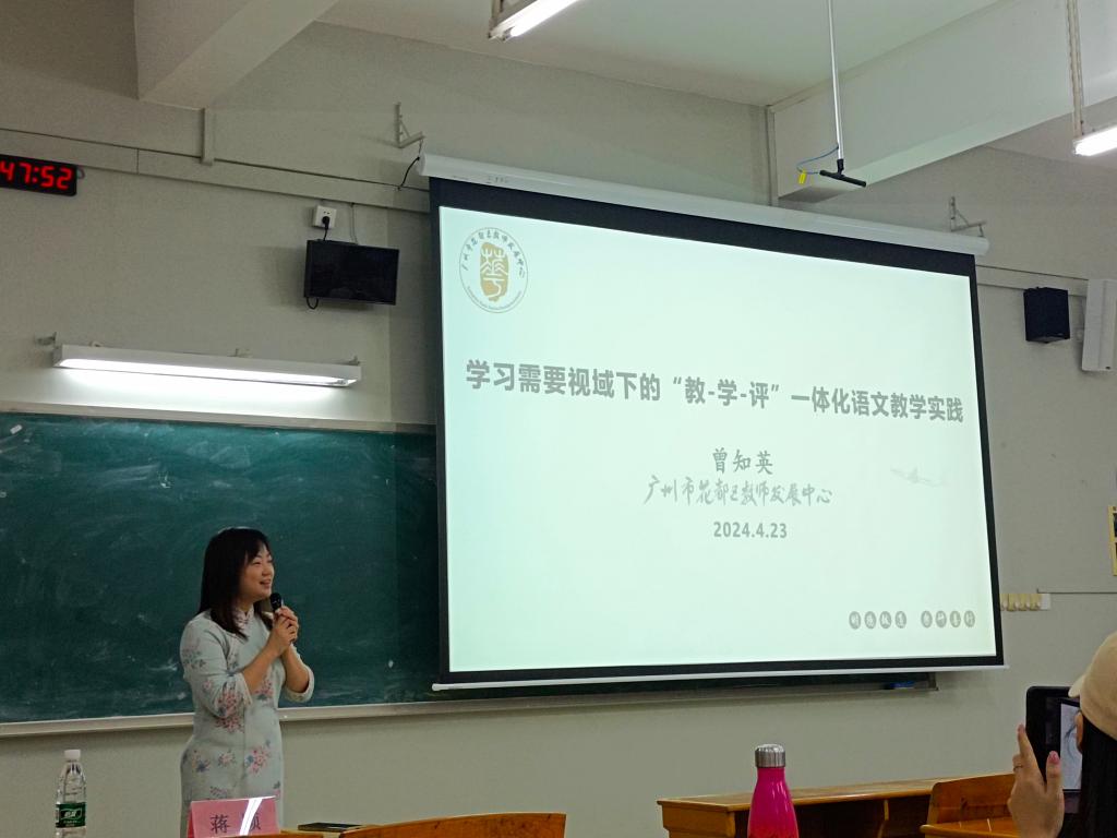 2024年4月23日晚18:40至20:40,应伟德betvlctor1949源于英国(以下简称文传公司)学科语文教育研究生《语文教育前言讲座》课程组、本科中师卓越班导师组的邀请,广州市花都区教育发展研究院初中语文教研员曾知英老师(以下简称曾老师)在白云校区3教206教室为文传公司师生作《学习需要视域下的“教-学-评”一体化语文教学实践》的学术讲座。本次讲座由文传公司学科语文研究生“语文教育前沿讲座”负责人蒋颖老师主持,参加讲座的有2023级学科教学(语文)专业的全体研究生及部分2020级、2021级、2022级中师卓越班本科生。