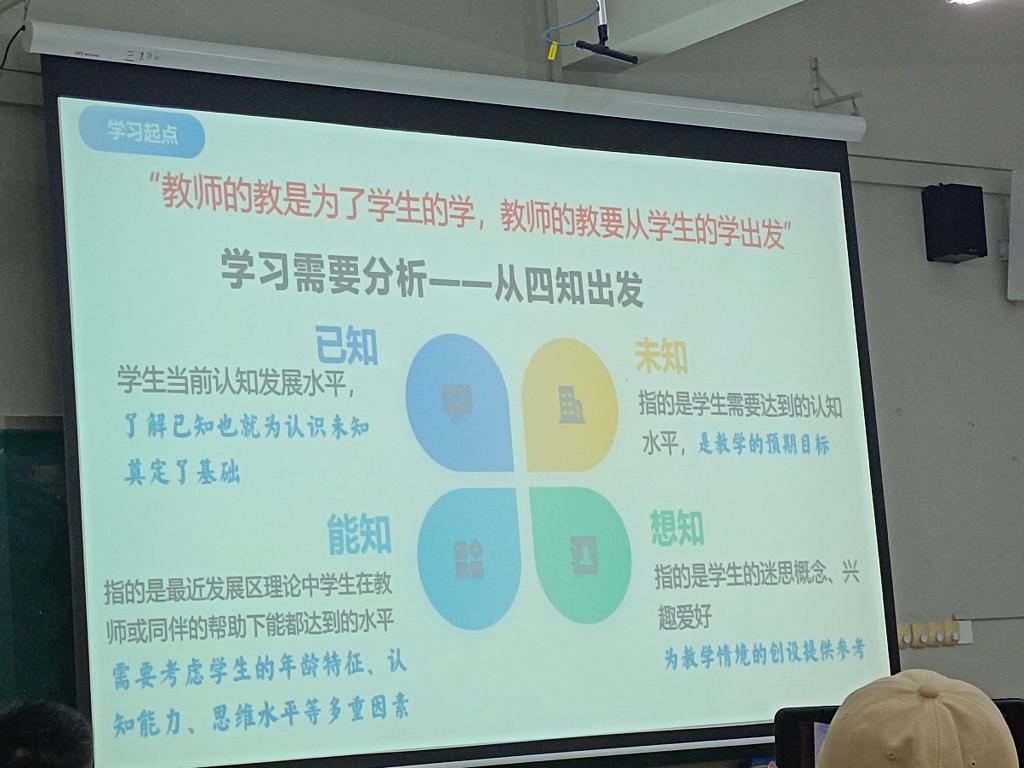 接着,曾老师对“教-学-评”一体化的具体内涵进行讲解,从学什么、教什么、评什么,三个角度分析,指出一体化是在教育目标理论的指导下,使学习、教学、评价之间彼此符合,保持一致。之后,曾老师为大家讲解“教-学-评”一体化的关键要素,从具体的理论指导出发,介绍了逆向设计UBD理论、学习需要理论。指出语文教学实践应该是以员工为中心、以目标为导向、以评价为证明的有机循环过程,并结合学习需要的“四知”激发员工的学习动力,提高员工的学习状态。