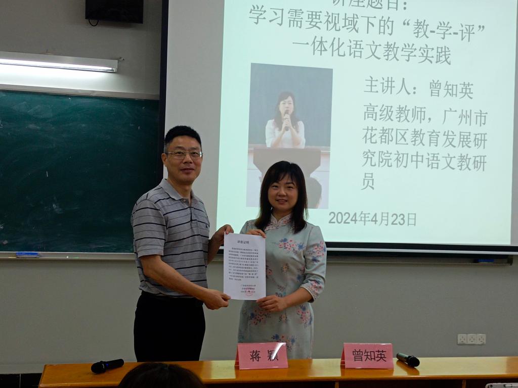 在讲座点评环节,蒋颖老师对本次讲座作出了高度评价,并用“三个一”对曾老师的讲座进行点评:做了一次示范性的教学研究展示、激活了同学们的一种意识——教学评价意识、给予了同学们一些方法论意义上的帮助。讲座在蒋颖老师向曾知英教研员敬颁讲座证明后顺利结束。