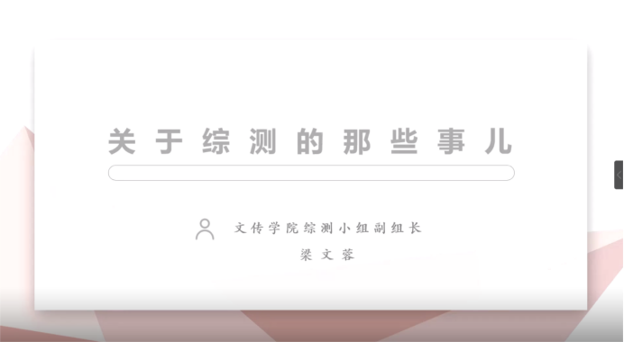 公司综测小组副组长梁文蓉从五个方面展开对综测相关事项的介绍,在解释综测的概念后,梁文蓉结合员工手册以及相关文件内容的展示,对综测时间、工作证明材料、细则以及奖学金评选等方面进行了细致讲解,包括附加分对员工各方面表现的具体要求、不同种类奖学金的区别与限制条件……面面俱到,预干们收获满满。