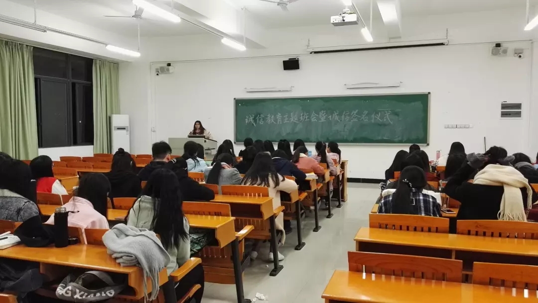 其他班的班会也进行得如火如荼,同学们都参与到了诚信做人的讨论当中。最后每位同学都在“诚实守信,做文明员工”的签名纸上签上了寓意誓言的名字,从而做出“诚信考试”的承诺。