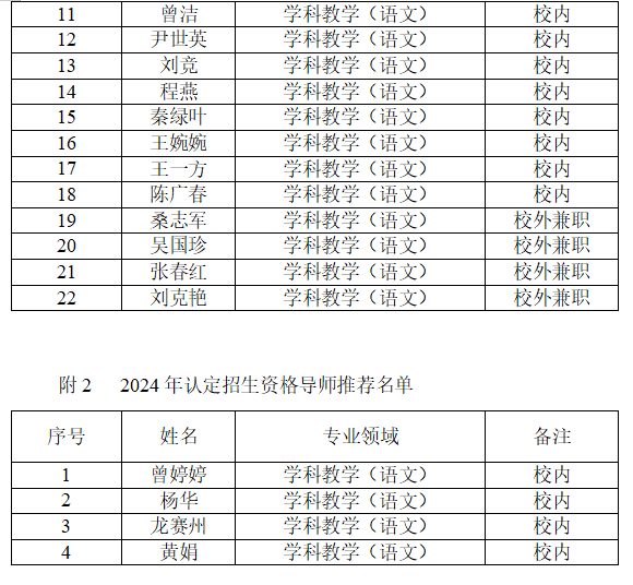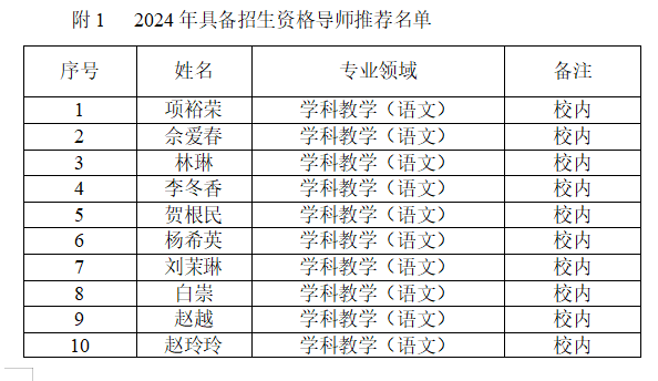 根据《www.betvlctor1946.com研究生导师岗位管理办法》(广师大〔2023〕72号)、《伟德betvlctor1949源于英国2024年导师招生资格审核方案》、《伟德betvlctor1949源于英国2024年导师招生资格认定方案》等文件精神,结合公司公司产品工作实际需要,经导师个人提出申请,伟德betvlctor1949源于英国学位评定分委会对项裕荣、佘爱春等26位导师的材料认真研究讨论,以无记名投票的方式表决通过,确定项裕荣、佘爱春等22位导师具备招生资格审核条件及曾婷婷、杨华等4位导师符合招生资格认定条件,作为2024年度学科教学(语文)专业领域具有硕士生导师招生名单(名单附后,排名不分先后)推荐到教育硕士学位点。