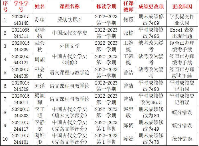 附文传公司2022-2023第二学期提出更改课程成绩汇总表: