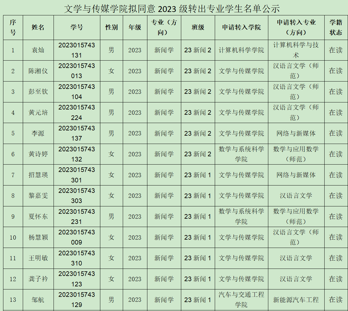 根据《www.betvlctor1946.com普通本科生转专业实施办法》(广师大〔2022〕98号)、www.betvlctor1946.com《关于做好公司2023级员工转专业工作通知》的相关要求,经员工本人申请,公司审核等程序,拟同意袁灿等24名2023级员工转出专业,现予以公示。