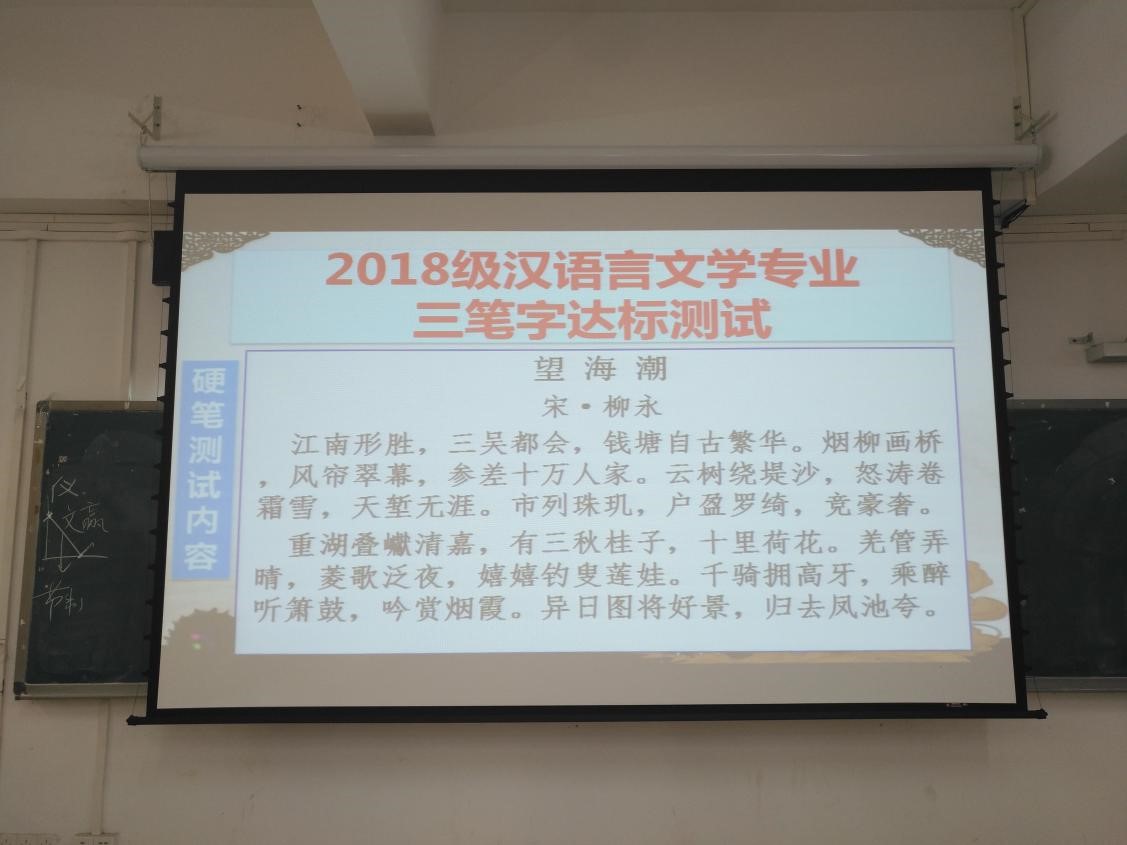 汉语言文学专业作为我国普通高校本科专业的老牌优势专业,已经有了很长的发展历史;而21世纪以来中国社会经济、文化、教育和科技的快速发展下,对应用型和复合型人才需求大大增加,对传统汉语言文学专业也提出了新的挑战。为了应对时代发展对中文专业人才的需求,公司汉语言文学专业进行了一系列卓有成效的改革实践,以“大文学”为学科基本理念,围绕着应用型和复合型人才的培养目标,构建了“教学、实践、文化”三位一体的育人体系,开展以“基础理论+实践教学”为核心、以“文化素养”为辅助的人才培养模式。近几年,更是借助师范专业认证和广东省一流专业建设的契机,大力推进汉语言文学专业的内涵发展,除了实施普师卓越语文教师培养计划、建构“基础理论+实践能力”的课程体系和建立三位一体的协同育人机制等外,还实施了“411”即“四个一百”工程、“三字一话”全员考核达标计划、“师范生技能”全过程培养计划等;而这次三笔字(硬笔)水平达标测试就是其中之一。从专业负责人佘爱春教授那里得知,为了提升和强化汉语言文学专业员工的专业能力、实践能力、创新能力和师范技能等各项能力,根据人才培养方案,在大一、大二主要完成“411”工程,大三主要进行三笔字水平达标考核,在本学期还要举行2018级的三笔字(粉笔)水平达标测试;对第一次没能达到水平考核要求的同学,还需在毕业实习前再进行一次测试,力求全员都通过考核,以良好的专业素养和基本技能迎接实习单位的考核。
