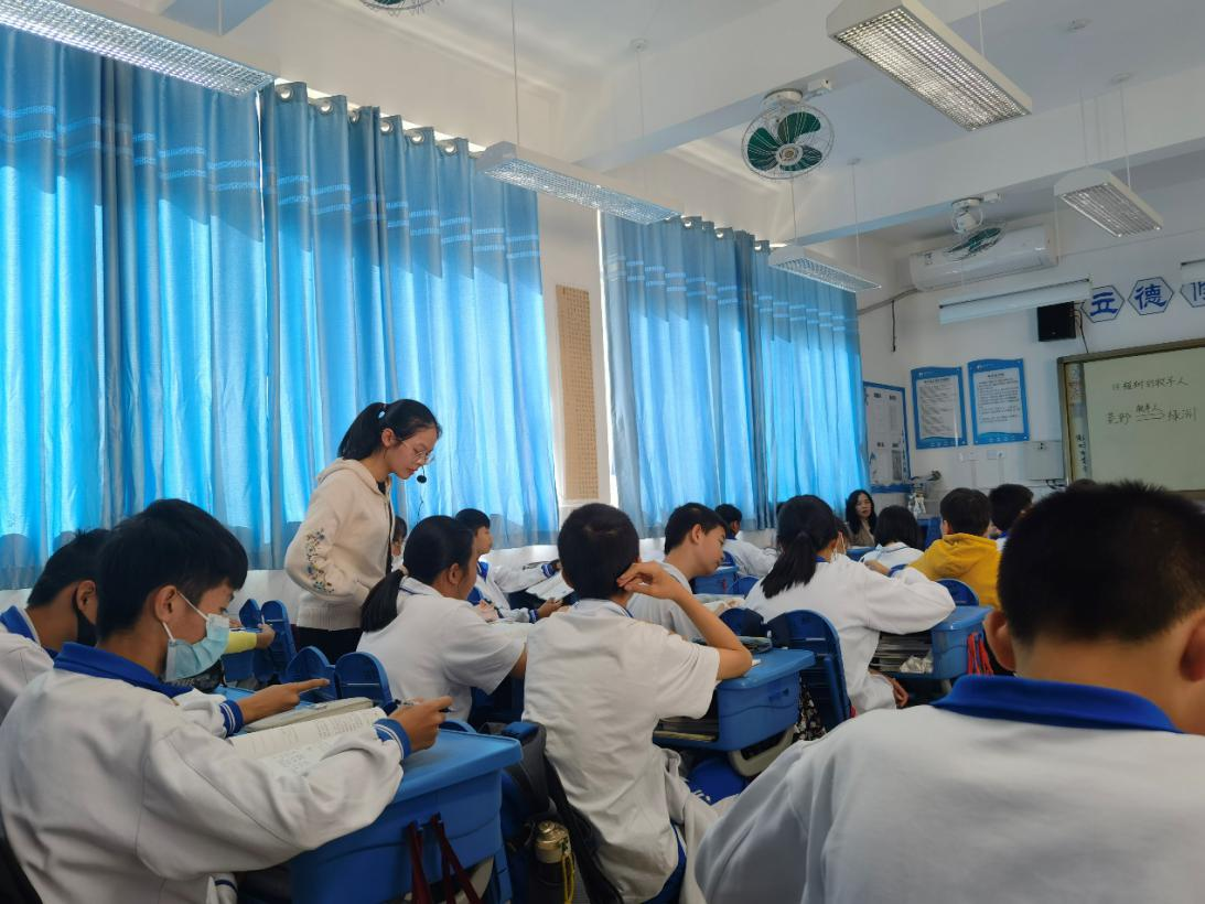 挂牌仪式之后,文传公司一行和全体实习生到初一(5)班听公开课,实习生叶卡妮以课文《植树的牧羊人》为内容进行讲授,课程的主要内容是按时间顺序梳理文章,分析牧羊人的形象和优秀品质。整堂课师生互动良好,课堂气氛活跃。