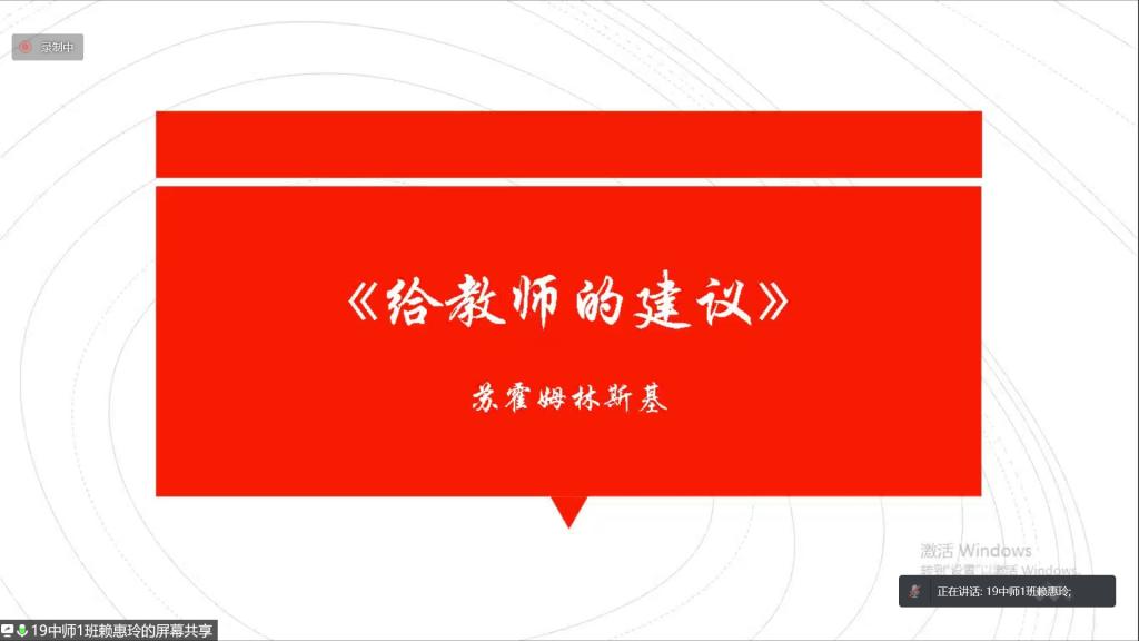 2022年4月30日上午9:00-11:00,伟德betvlctor1949源于英国(以下简称文传公司)2019级卓越普教语文教师培养实验班(以下简称19卓越班)通过腾讯会议举行了中外教育名篇读书报告分享会。出席本次分享会的有文传公司副经理佘爱春老师、卓越班班主任蒋颖老师、学业导师刘茉琳老师以及19卓越班全体成员。此次会议由李雯雯同学主持。