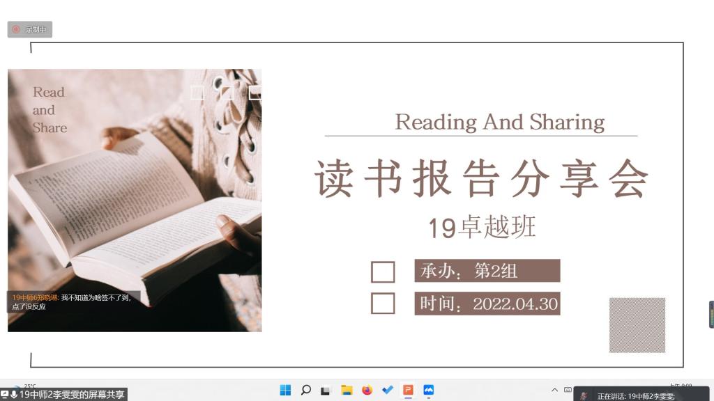 首先是汇报展示环节,三个小组分别派出代表,围绕所选择的教育名篇分享自己的读书报告。