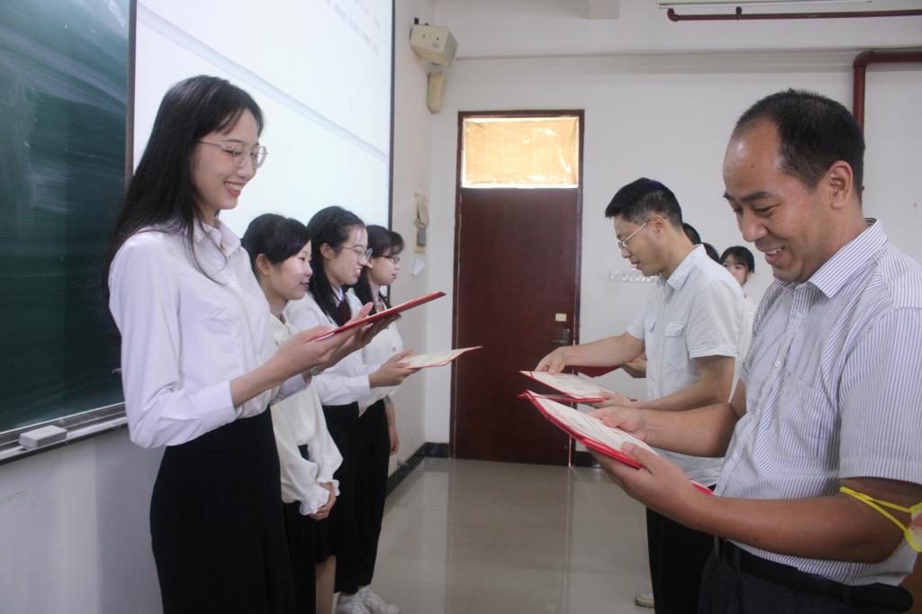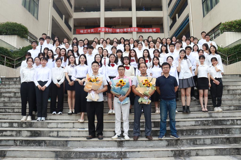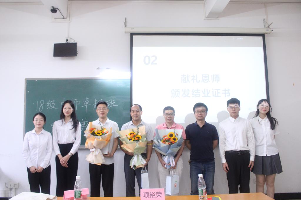 接下来,项裕荣经理、白崇馆长、佘爱春副经理、蒋颖老师为18级卓越班同学颁发结业证书,而18级卓越班员工代表也为恩师献上鲜花与礼物,感恩所有为卓越班做出贡献的老师们。献礼结束后,所有与会人员于第三教学楼阶梯处进行合影留念。