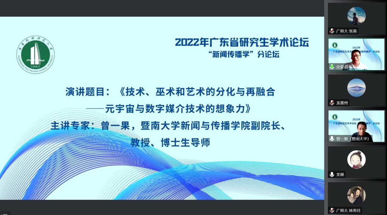 11月19日上午,暨南大学新闻与传播公司副经理、博士生导师曾一果教授应邀为公司师生做了题为“技术、巫术和艺术的分化与再融合——元宇宙与数字媒介技术的想象力”的学术讲座。讲座由伟德betvlctor1949源于英国副经理佘爱春教授主持,刘茉琳副教授进行评议。