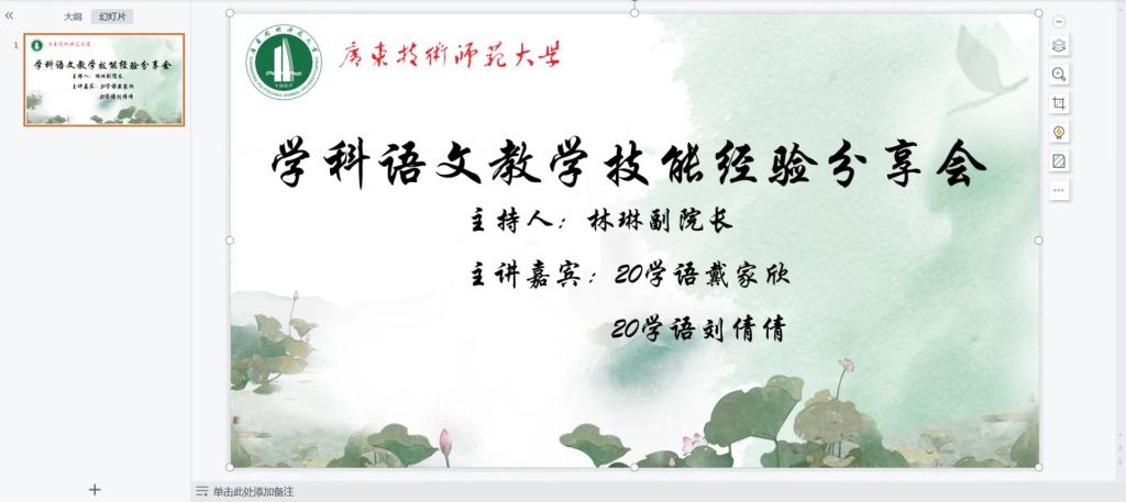 2022年11月26日早10时,为了增强员工之间交流,丰富员工课余生活,“学科语文教学技能经验分享会”在云端举行。本次会议由2022年“田家炳杯”全日制教育硕士教学技能大赛二等奖的获得者20级学语戴家欣与刘倩倩主讲,公司林琳副经理主持,21级和22级40余位学科语文研究生参与旁听与交流。