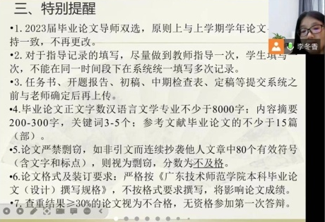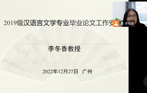 实习工作总结完毕后,李冬香教授就2019届汉语言文学专业毕业论文工作进行了安排。首先,李老师强调了毕业论文的重要性。她指出,毕业论文是实施专业培养目标的重要步骤,是培养同学们理论联系实际的有效手段。因此,她希望同学们高度重视毕业论文工作。随后,详细介绍了毕业论文各个阶段的任务以及时间节点,对毕业论文过程中一些非常重要的信息进行了特别提醒。最后,对同学们毕业论文撰写提出了一些具体的要求,尤其强调要严格遵守学术规范,严禁剽窃,希望同学们能以一篇优秀的毕业论文给自己的老员工活画上圆满的句号。