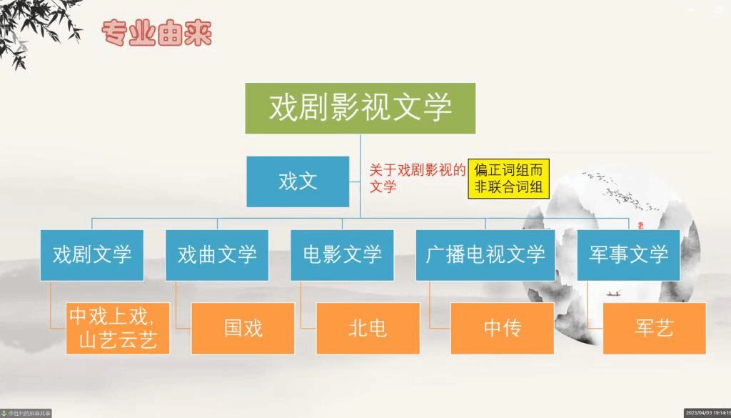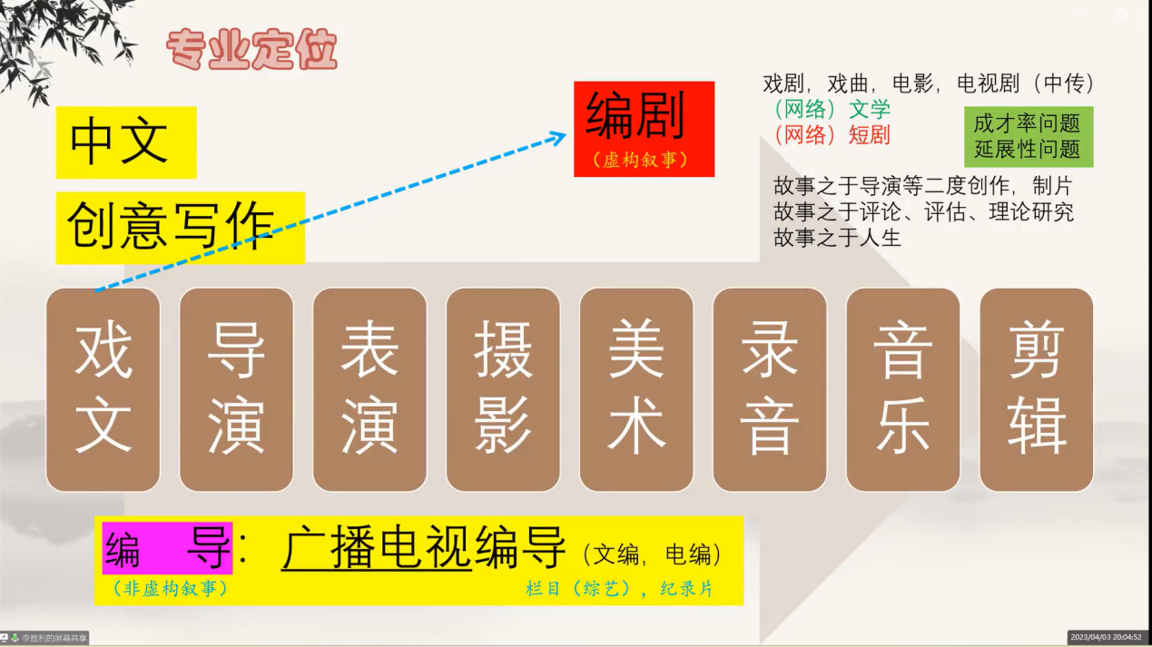 一、从“专业由来”“专业定位”“教学理念”“教学方法”等方面对目前国内戏文专业的整体情况进行了介绍。他首先简要梳理了戏文专业的在国内的发展历程,进而对 “戏剧影视文学”概念进行了解释,指出,戏剧影视文学是关于戏剧影视的文学,侧重点在于戏剧和影视,而不是戏剧、影视、文学三者并列相加。李教授介绍说,戏文专业本质上就是编剧专业,以虚构类的故事创作为核心课程。李教授对戏文专业为何把“故事创作”设定为核心课程进行了详细分析,并将戏文专业与中文、创意写作、广播电视编导等相近专业进行了比较,以阐明其学科特色。接下来,李教授分析了如何看待戏文专业的成材率问题,以及员工就业面的延展性问题,并对不同公司戏文专业如何确立自己的发展方向发表了见解。最后,李教授向老师们介绍了在OBE理念的指导下,如何实施以创作带理论的教学方法,如何通过成果激励激发员工的创作兴趣,以及采用怎样的训练体系促进员工的创作等问题。