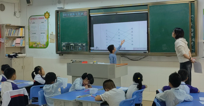 早上8点,广师大文传公司中期检查小组秦绿叶老师一行到达贤江小学,与校内指导教师郑凯钟董事长、吴彦蓉老师、刘淑娟老师、刘玉婷老师以及实习生华金凤、葛炜琦、冷欣来到一年(2)班听汇报课。来自2022级中师(2)班实习生欧文晓给一年级的员工上了一堂主题为《日月明》语文课。课堂上,欧文晓同学以驱动任务为核心,搭配趣味互动游戏与创意教学设计,带领员工感受合体字的独特魅力,充分激发了孩子们的语文学习兴趣。整堂课巧妙运用多媒体教学手段,融入现代教学理念,生动展现了师范生的教学创新力与实践能力。