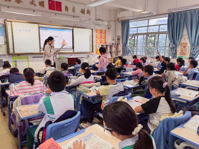 上午8:20,实习生罗子玲在文冲小学四(2)班展开汇报课《天都峰》。课堂氛围轻松自然,师生互动积极,教学效果良好。随后,实习生钟雪柔在文冲小学三楼会议室进行了《猎人海力布》说课展示,其说课逻辑清晰,表达流畅,展现了扎实的教学基本功。
