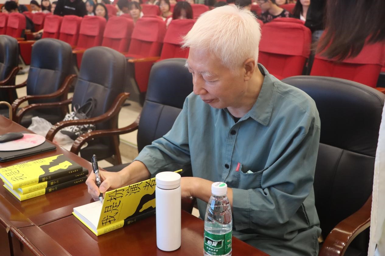 在讲座的最后,鲍十先生与现场同学积极互动,面对同学们提出的关于“汪曾祺个人魅力的理解”“萧红作品的解读”等相关问题,鲍十先生都耐心地予以解答。整场讲座座无虚席,反响热烈。讲座结束后,鲍十先生给参与互动的同学赠送自己的著作,并签名合影留念。
