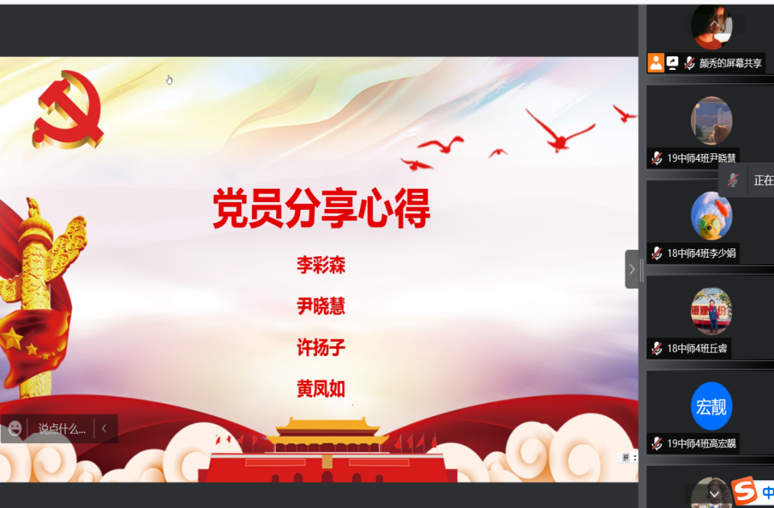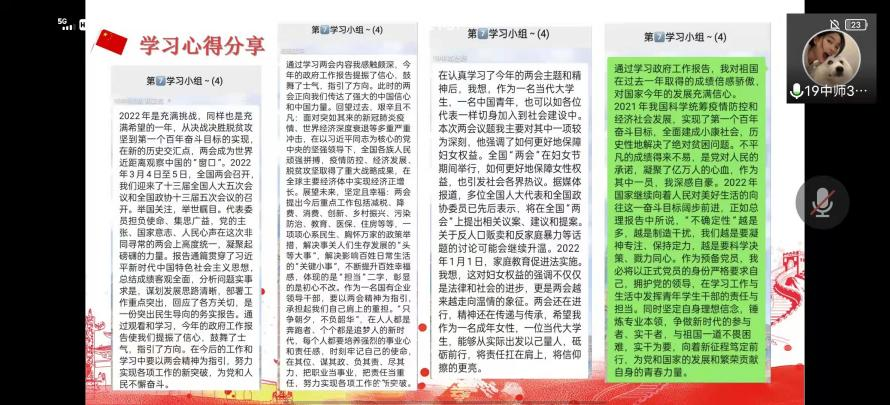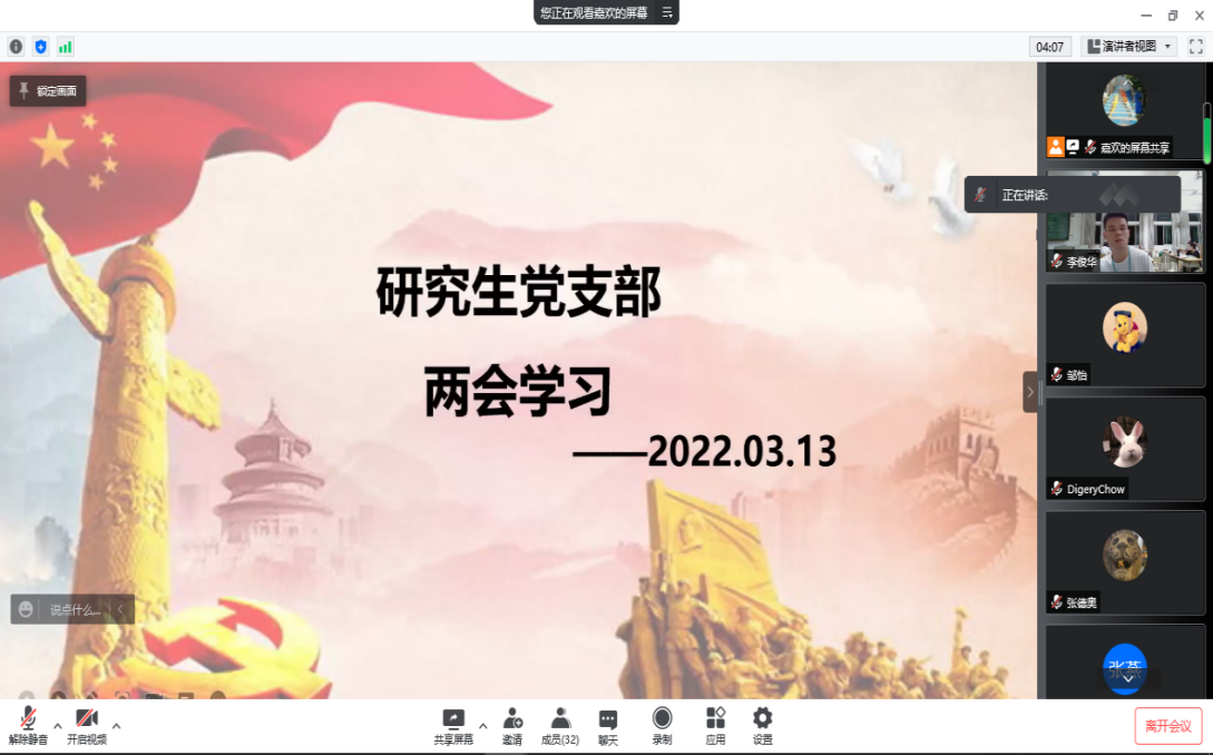研究生党支部于2022年3月13日在线上召开了两会学习活动。张燕、陈淑洁、李小禅三位同志在会上分享了两会概况与自己的心得体会,其他党员同志就三位汇报者的分享进行自由发言。会后,全体党员都写下了自己的学习心得,积极贯彻落实两会精神。