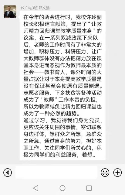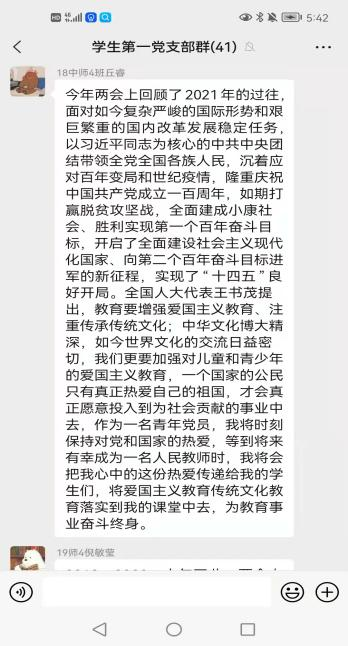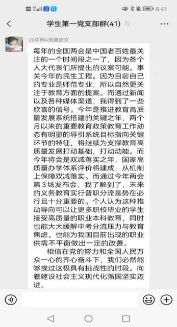 会后,各支部的党员都了解了人民的发声,并表示会继续贯彻两会精神、认真履行党员义务、充分发挥党员的先锋模范作用,为建设祖国、服务社会贡献出自己的力量。党员们将在接下来的人生旅途中不懈奋斗,做一名有理想、有担当、有本领的新青年,将青春绽放在祖国需要的地方。