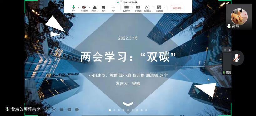 第五小组则聚焦于两会中的“双碳”话题,分别从双碳的含义、意义及举措进行了详细的介绍与分享,如今,全国各地都在积极地响应国家的“双碳”工作,同志们在为祖国的强大、人民的团结感到自豪的同时,他们也希望祖国能早日实现新能源高质量发展。