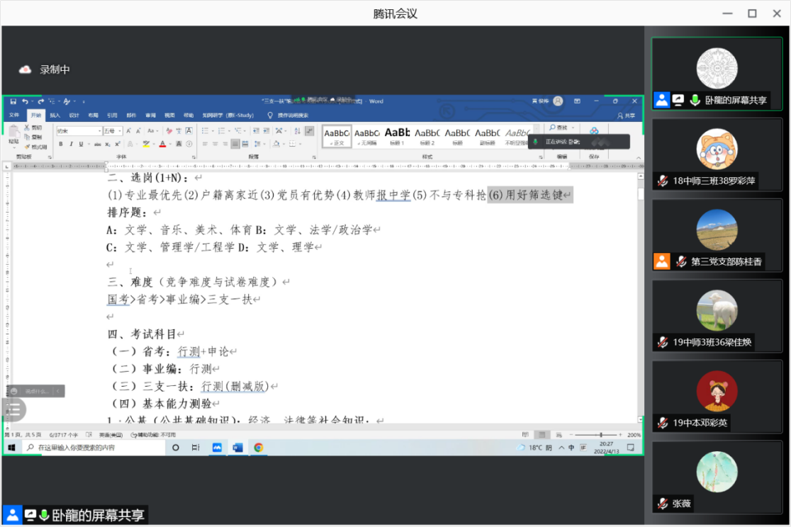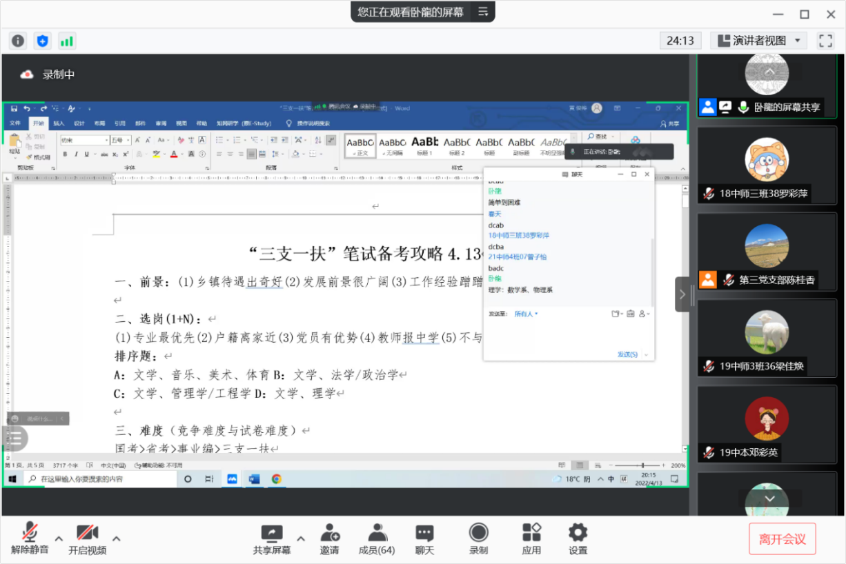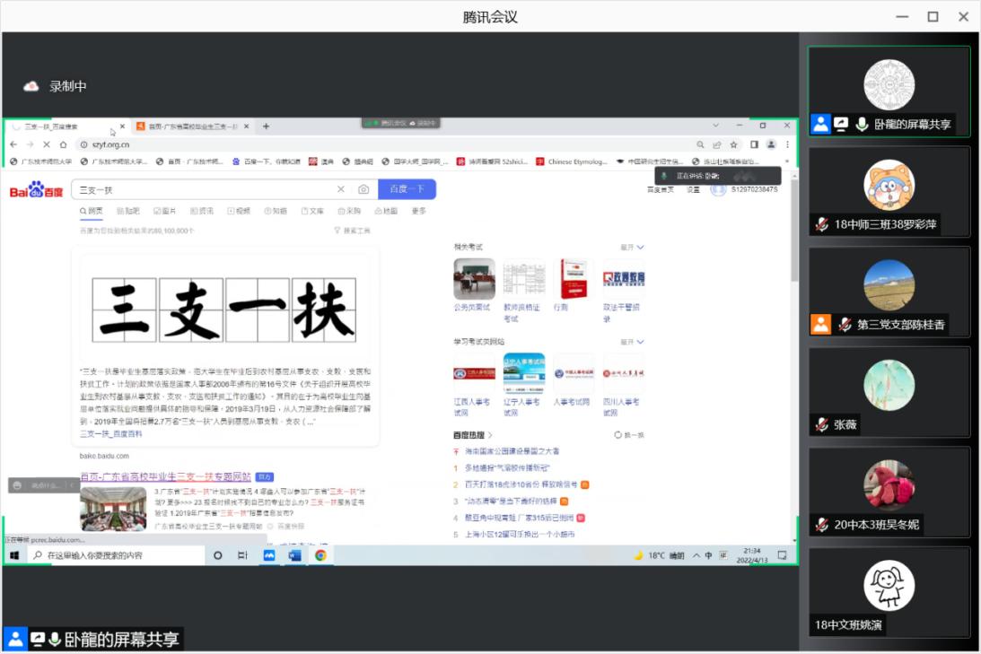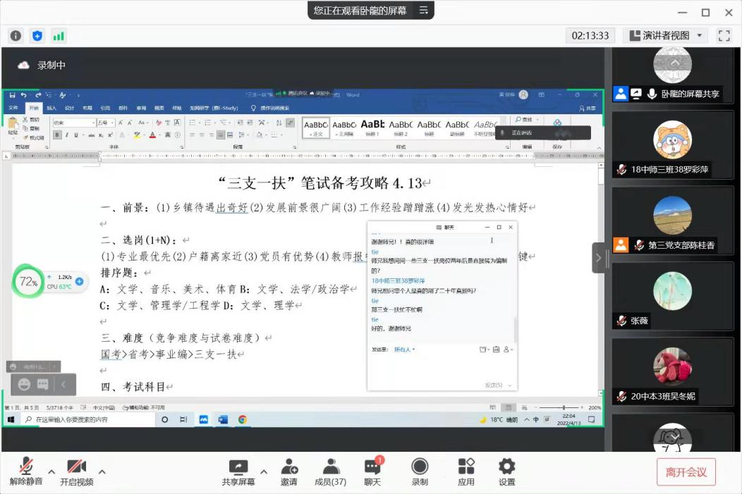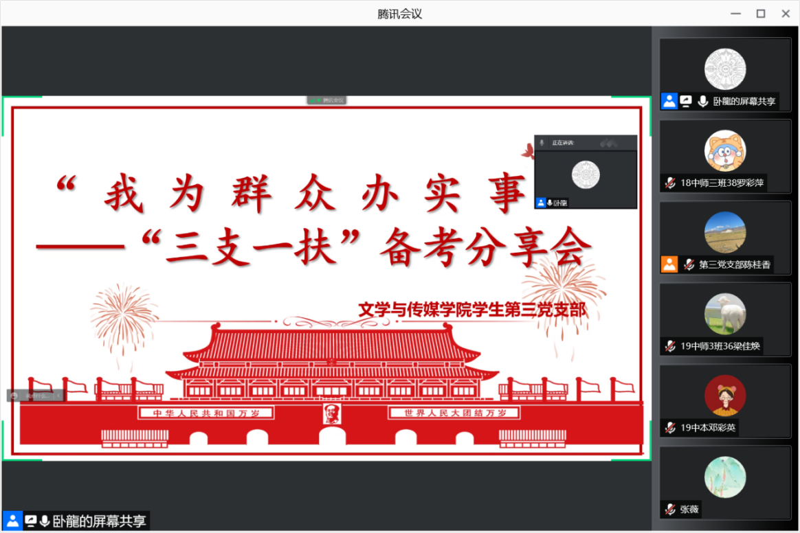 广东省“三支一扶”考试的通知发布后,员工第三党支部了解到公司中存在许多备考“三支一扶”员工对考试“不知所措”的问题。为发扬党员“我为群众办实事”精神,本支部联系到对“三支一扶”考试有丰富经验与收获的21届优秀员工黄俊桦师兄,开展了“三支一扶应试备考线上分享会”,让有意愿备考的同学更加明确“三支一扶”的备考内容和方法。