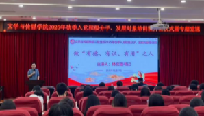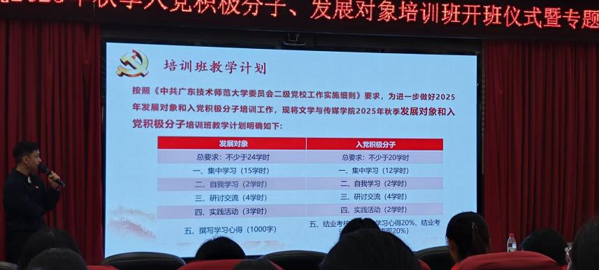 随后,周汉阳老师对培训班的理论课程设置、实践活动安排、考核评定标准进行了详细讲解,希望学员们能认真学习党的理论知识,深入了解红色革命文化,认识共产党员肩负的使命。周汉阳老师鼓励学员们以党员标准严格要求自己,主动向党组织靠拢,在学习实践中锤炼党性、砥砺品格,争取早日加入中国共产党,以初心赴使命,用实干显担当。