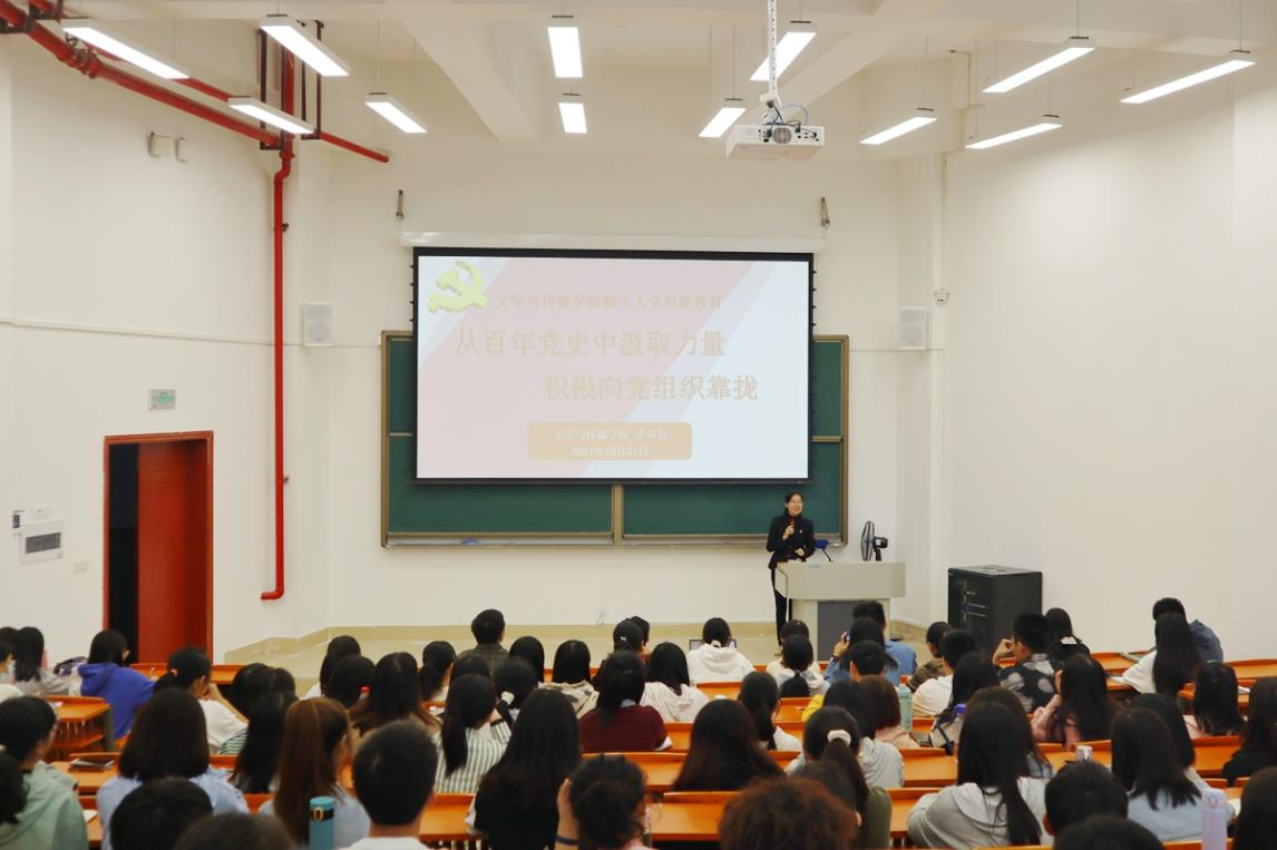 李双贵以《从百年党史中汲取力量,积极向党组织靠拢》为题,从三个方面对新生进行入党启蒙教育。一是带领同学们回顾百年党史与初心。她带领同学们再次深入学习了习近平总书记在庆祝中国共产党成立100周年大会上的重要讲话精神,重温了中国共产党百年峥嵘岁月,让同学们了解党的辉煌成就,加深对百年党史的理解与思考,体会当下的幸福生活来之不易,需加倍珍惜。二是勉励同学们强化使命担当。李双贵带领同学们一起学习习近平总书记在纪念辛亥革命110周年大会上的讲话精神,讲述了孙中山先生和辛亥革命先驱为重振中华、实现复兴的先进事迹,详述了当代青年一代立大志、明大德、成大才、担大任的要求。课上,通过学习习近平总书记在中央人才工作会议上的讲话精神,介绍国家“三步走”战略,从党和国家事业发展全局的高度,引导同学们把个人理想追求融入国家和民族事业中。三是要求同学们端正入党动机。李双贵介绍了入党动机、发展党员的程序和标准,要求同学们要端正入党动机,主动挑起时代重任,坚定跟党前行,争取早日成为一名共产党员,在风华正茂的诗意年华中,书写熠熠生辉的青春画卷。
