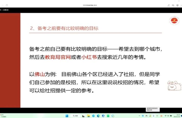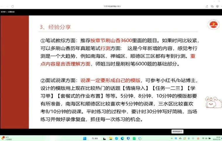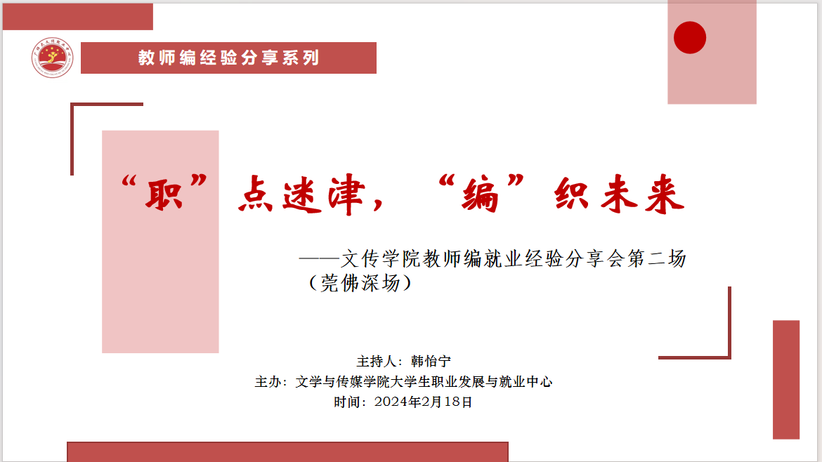 为回应有意愿考取莞佛深地区教师编的学子的热切期盼以及为其他学子提供考编信息参考,文传就业中心于2024年2月18日19:30举办了莞佛深场的线上经验分享会,持续助力考编学子高质量就业的实现。