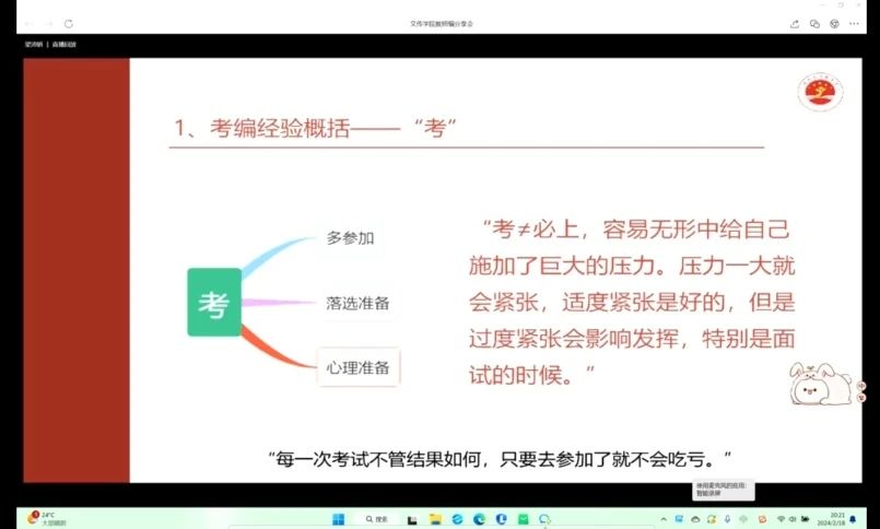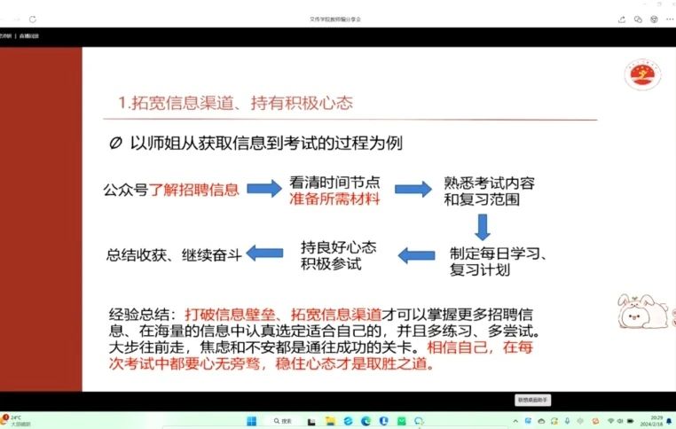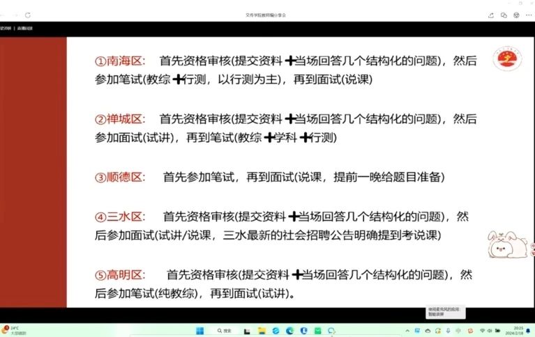 第二位上岸佛山某教师编的师姐则为同学们详细说明了考编的流程。师姐不断提醒我们考编首先要时刻关注每个地方的招聘信息,其次要确立明确的目标、收集当地的考编信息。最后师姐从笔试教综合面试说课的方面与同学们分享了考编的经验。