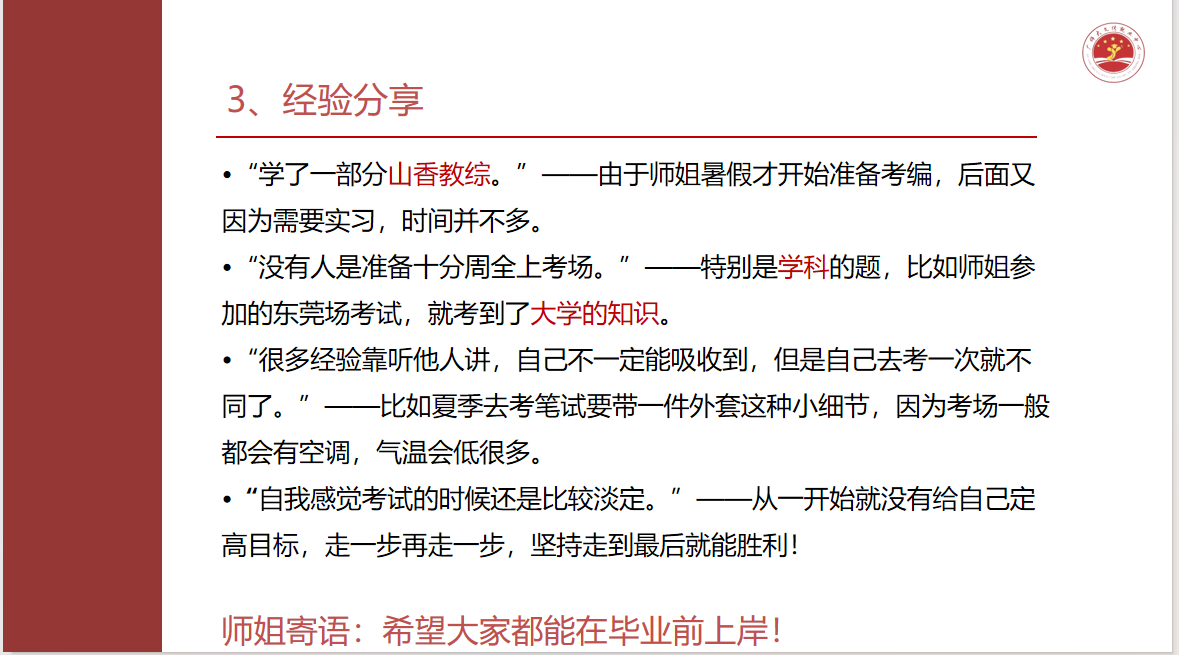 为者常成,行者常至。希望文传公司有考编意愿的毕业生可以通过此次经验分享会从海量的考编信息中选择适合自己的复习资料,保持稳定的心态,乘着过来人的经验顺利上岸!最后,来日方长,愿毕业生们前程似锦!